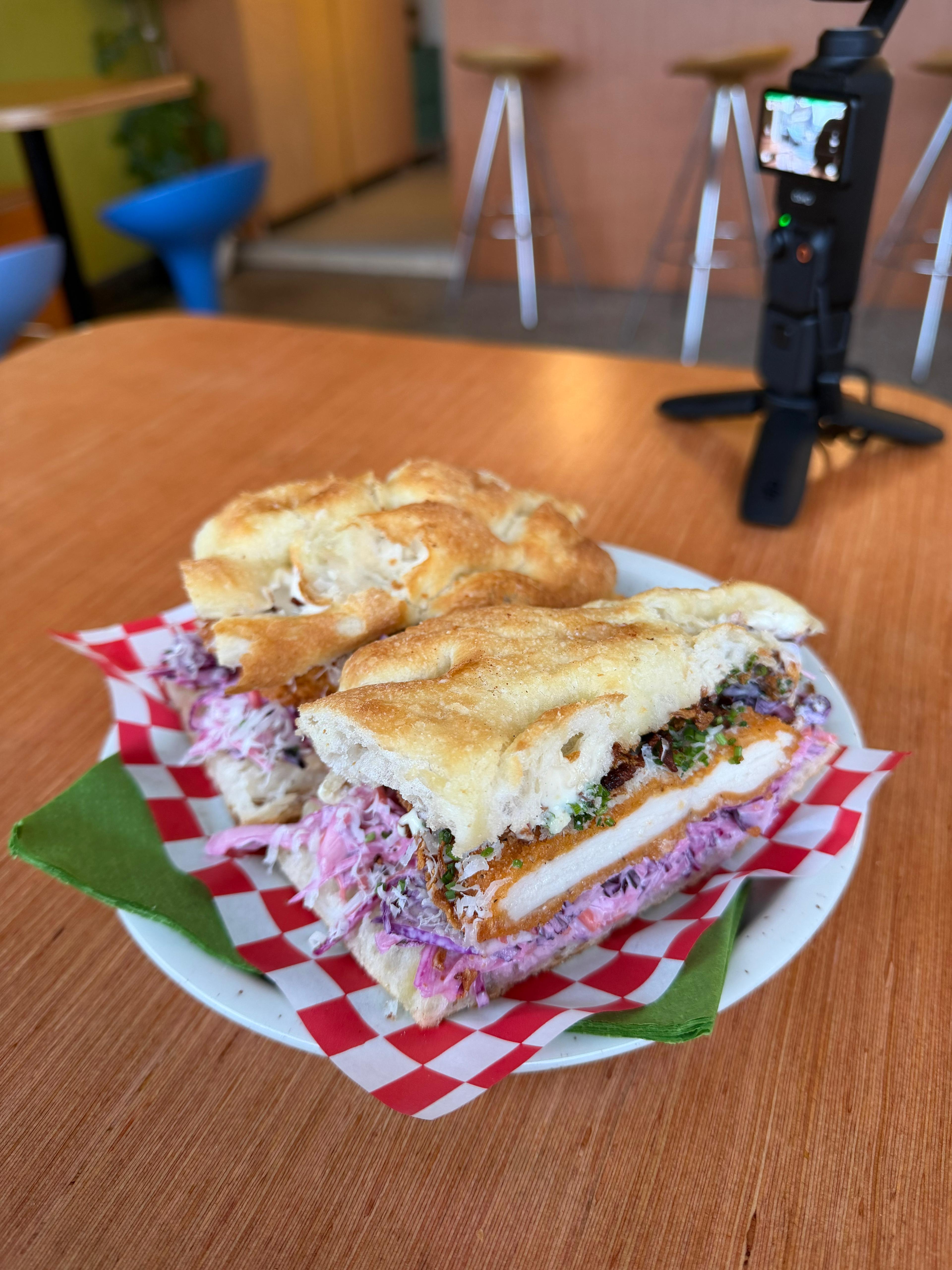 Bij BAR PIETRO, een zaak die net een paar dagen open was, gingen we voor het broodje Ceasar (€14,00). Dit werd geserveerd op een krokante schiacciata en belegd met gepaneerde kipschnitzel (niet huisgemaakt), coleslaw, kalkoenbacon, kaas en een sausje. De kaas was meteen dominant aanwezig, iets te sterk naar onze smaak, maar daar konden we doorheen kijken en verder klopte het plaatje. Het brood was lekker krokant, goed zout van het vet, en de hele combinatie voelde vers. Al met al een broodje waarvan we begrijpen dat mensen dit lekker gaan vinden.